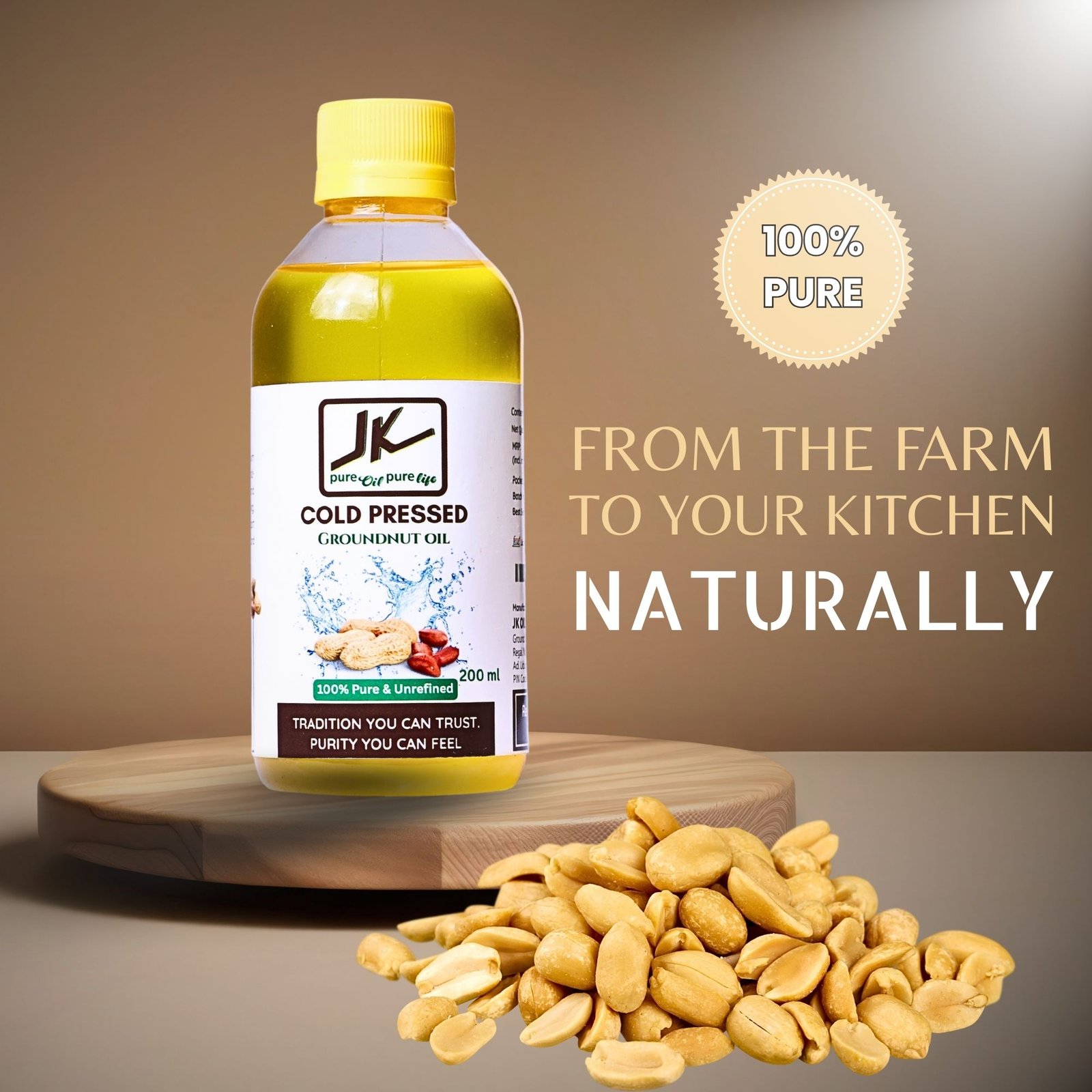 Experience natural goodness in a small pack with JK Cold Pressed Groundnut Oil – 200ml. Made from premium-quality groundnuts and extracted using the traditional wooden cold-press (ghani) method, this oil is rich in nutrients, antioxidants, and authentic flavor—free from chemicals or preservatives.