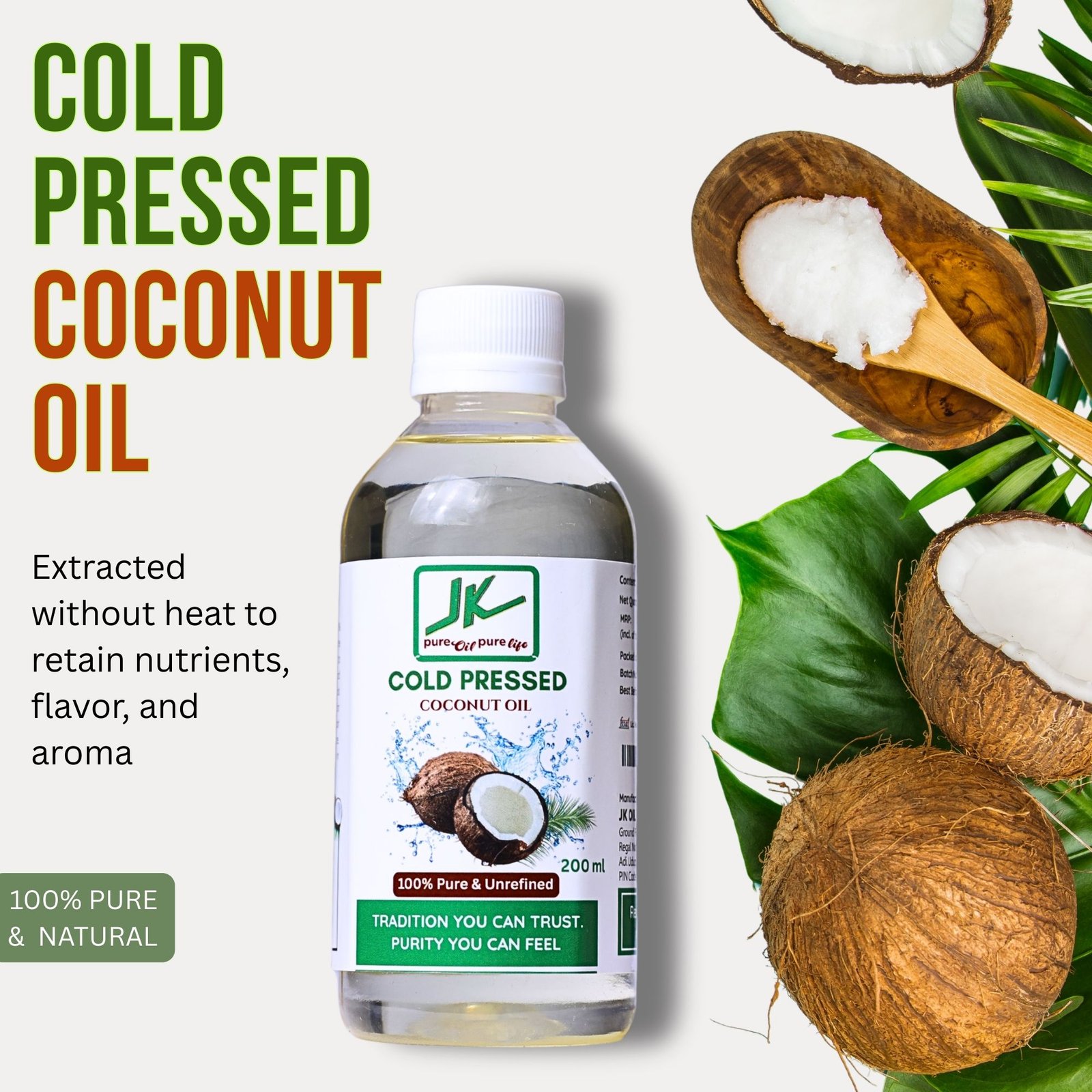 Experience natural purity in a compact form with JK Cold Pressed Coconut Oil – 200ml. Extracted from high-quality, sun-dried coconuts using the traditional wooden cold-press (ghani) method, this oil retains its essential nutrients, rich aroma, and natural flavor – without heat, chemicals, or preservatives.