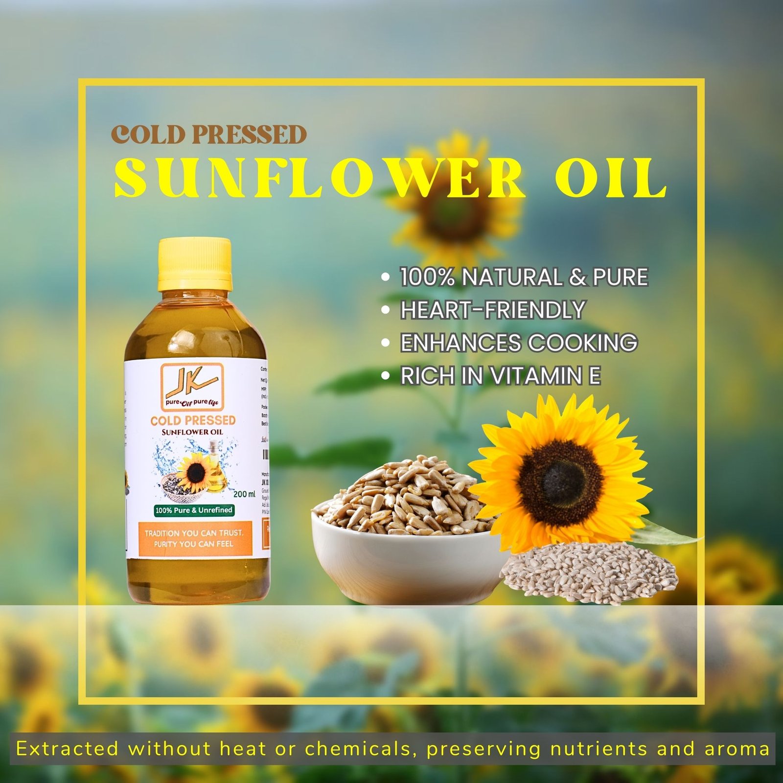 Enjoy clean, healthy cooking with JK Cold Pressed Sunflower Oil – 200ml, made from premium sunflower seeds using the traditional wooden cold-press (ghani) method. This natural extraction process preserves the oil’s essential nutrients, light aroma, and golden clarity, without any chemicals, heat, or preservatives.