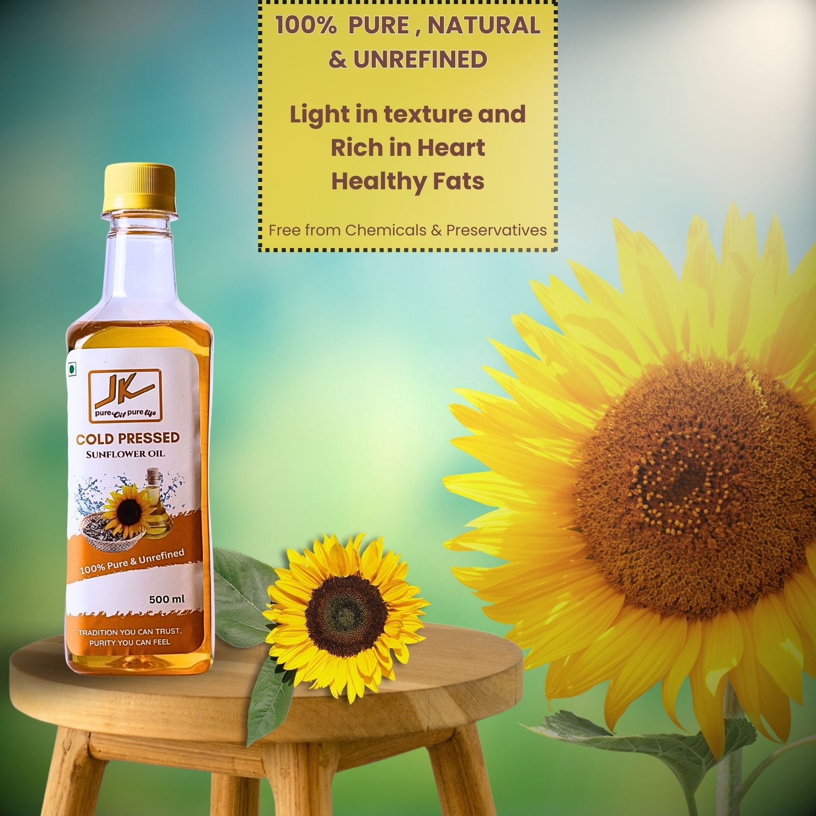 Enjoy healthy cooking in a compact pack with JK Cold Pressed Sunflower Oil – 500ml. Extracted from premium sunflower seeds using the traditional wooden cold-press (ghani) method, this oil retains its natural nutrients, Vitamin E, and mild flavor, with no heat or chemicals involved.