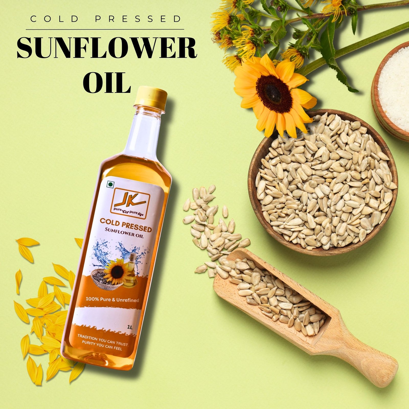 Switch to healthier cooking with JK Cold Pressed Sunflower Oil – 1 Litre, extracted from high-quality sunflower seeds using the traditional wooden cold-press (ghani) method. This natural process retains the oil’s essential nutrients, Vitamin E, and light flavor, without the use of heat, chemicals, or preservatives.